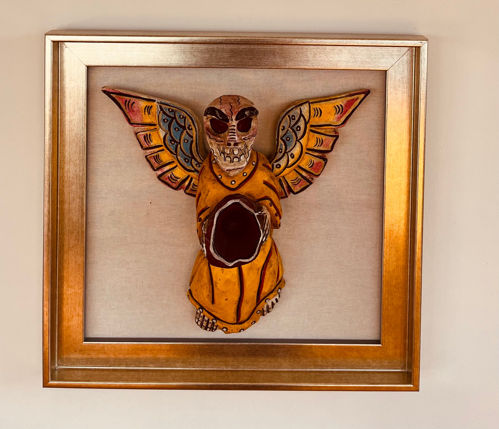 Conjunto de cinco tallas de madera policromada de la tradición guerrerense, montadas en marcos individuales. El juego reúne ángel-diablo, ángel calavera, ángel oferente, ángel arrodillado y Virgen sin alas: un diálogo entre lo sacro y lo festivo propio de la cultura de Guerrero.