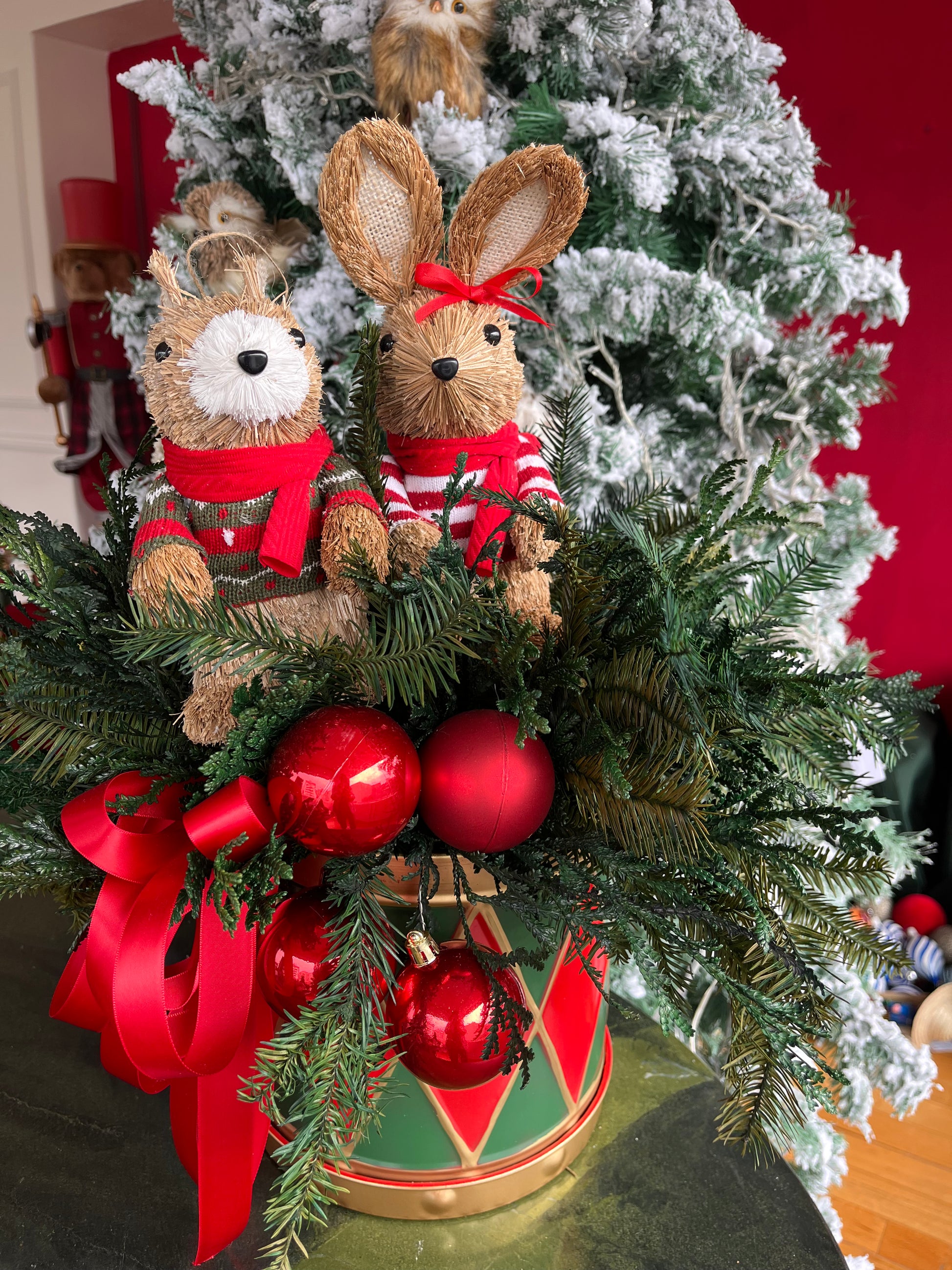 Composición decorativa elaborada sobre un tambor cubierto con pino natural preservado, adornado con esferas brillantes y listones en tonos festivos. Dos conejos en baritas de madera coronan la pieza, creando una escena invernal que combina naturaleza, fantasía y tradición. Ideal para decorar mesas, consolas o vitrinas, aportando calidez y sofisticación a los espacios de Navidad.