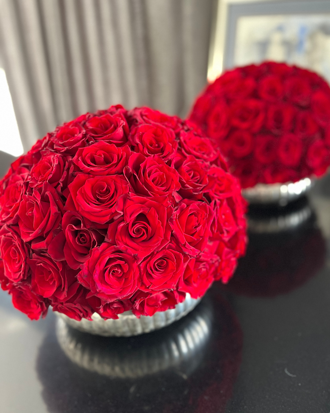 Descripción de la pieza: Un ícono de sobriedad lujosa. Esta pieza es una declaración de poder, belleza contenida y tradición. Sobre una base de plata, florece un bouquet denso, impecable, con rosas que desafían al tiempo y al olvido. Es el centro de mesa que transforma cualquier espacio en un acto de presencia.