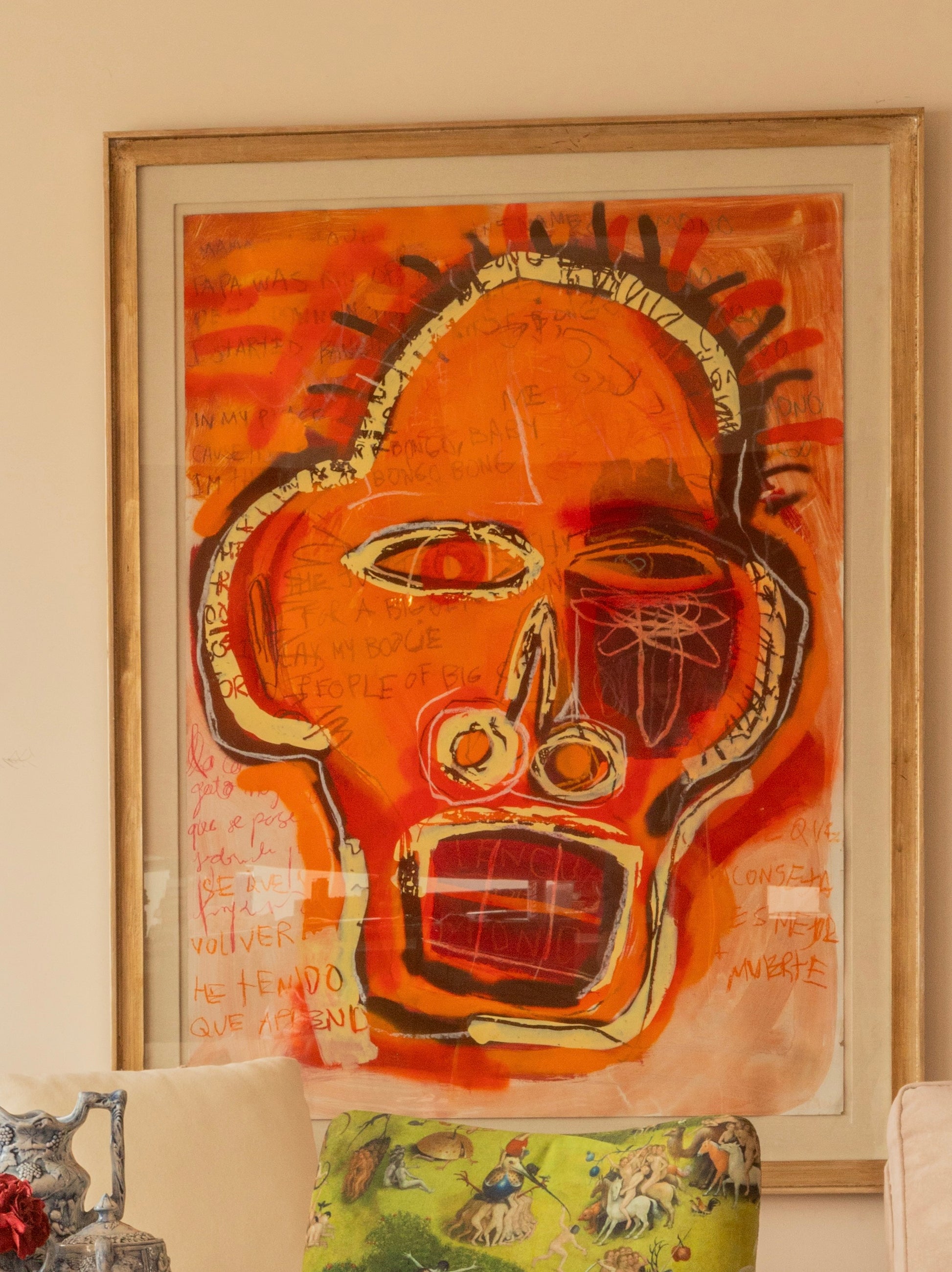 La figura central —una máscara, un rostro, un eco ancestral— se funde en una explosión de pigmento y emoción. Cada trazo vibra como un pensamiento urgente, un grito contenido, una confesión escrita sobre la piel del color.