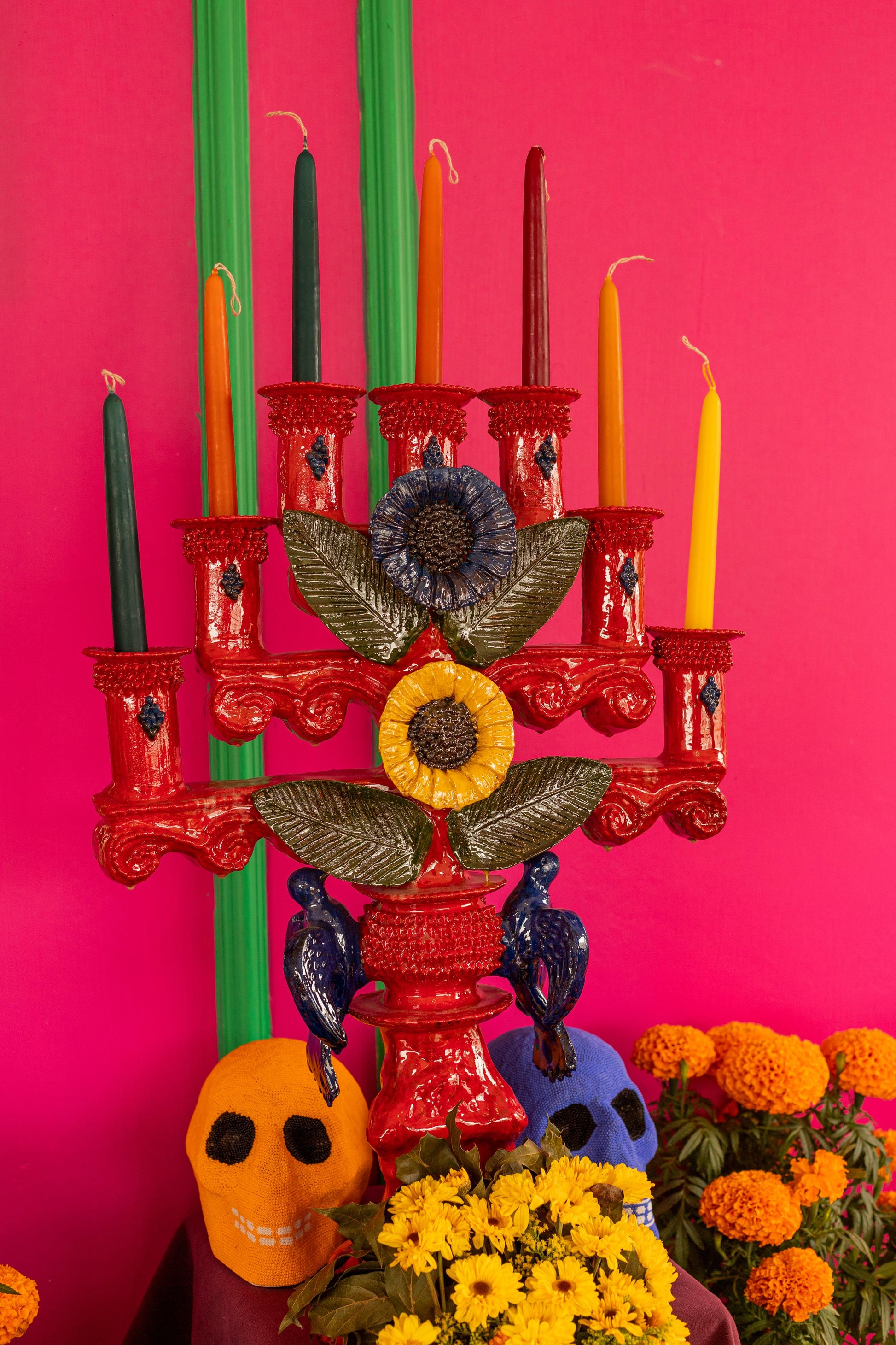 El barro se convierte en ofrenda luminosa. Cada flama encendida sobre este candelabro rinde tributo al sol y a la vida misma, recordando que el arte popular mexicano es también una forma de oración visual.