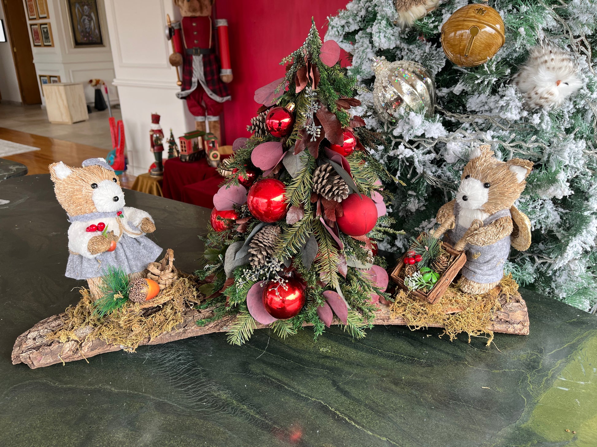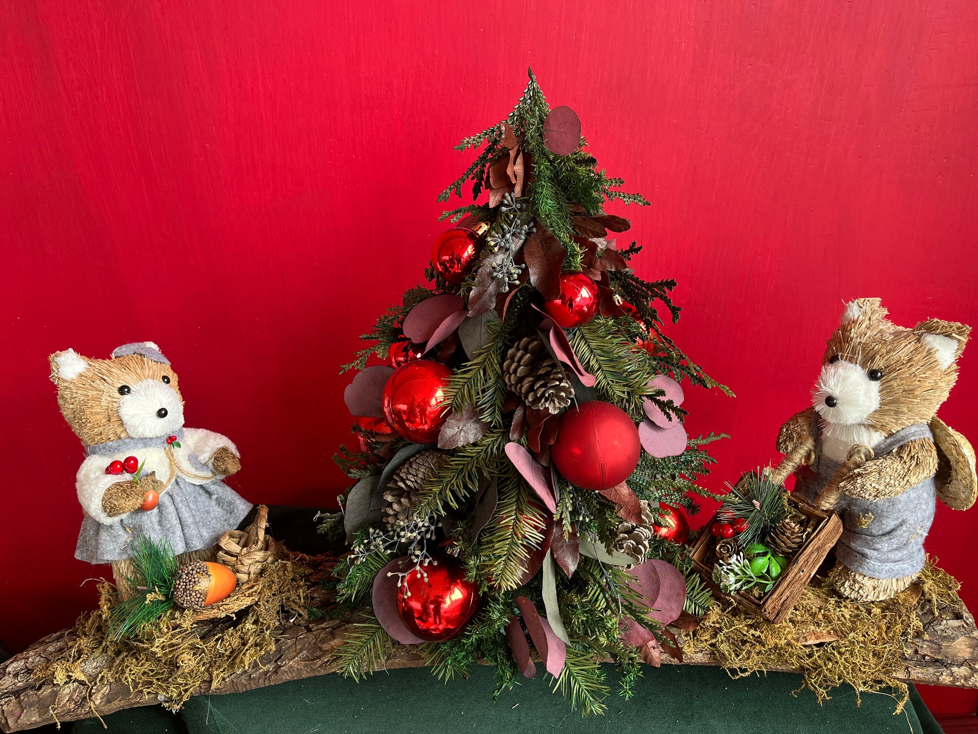 Composición navideña con un pino natural preservado montado sobre un tronco de madera, acompañado por una familia de osos jardineros tallados en baritas. La escena representa la preparación del bosque para la Navidad: un momento donde la naturaleza, el arte y la ternura se encuentran. Cada elemento está dispuesto con equilibrio y detalle, evocando la magia invernal.