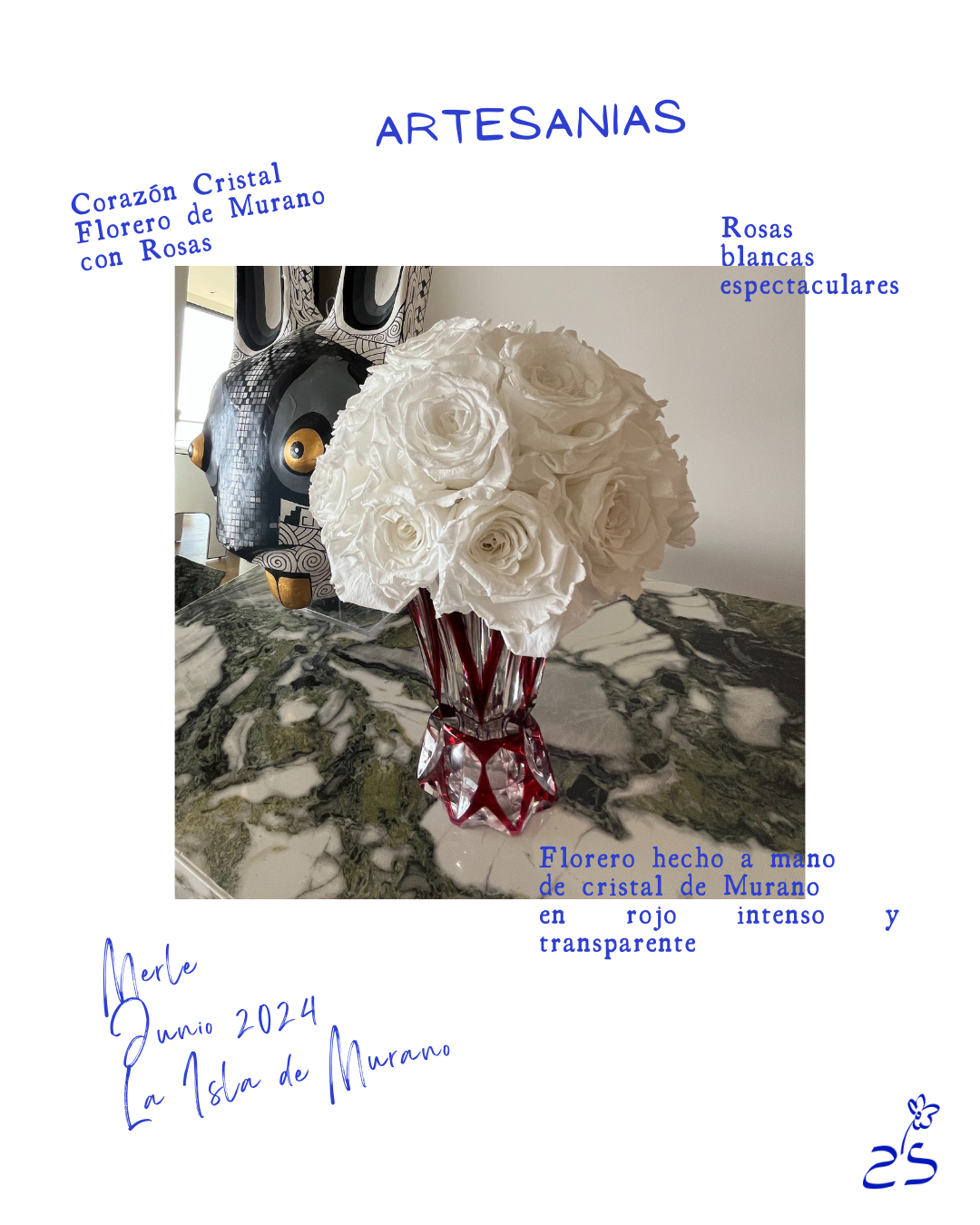 Esta pieza de cristal de Murano en rojo intenso y transparente sostiene una composición de rosas blancas preservadas que parecen flotar.