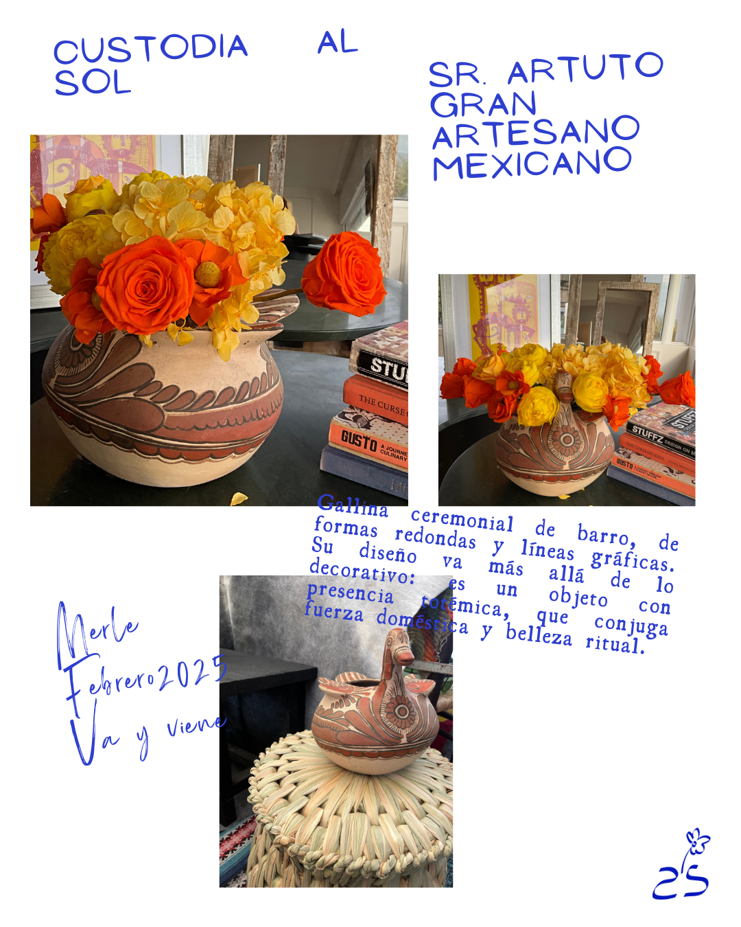Sobre el artista o artesano: Don Arturo es un maestro alfarero de Michoacán que trabaja el barro con sabiduría ancestral. Cada una de sus piezas encarna la tradición, la memoria y la espiritualidad de los pueblos que han modelado el barro como extensión de sus creencias y su vida cotidiana.
