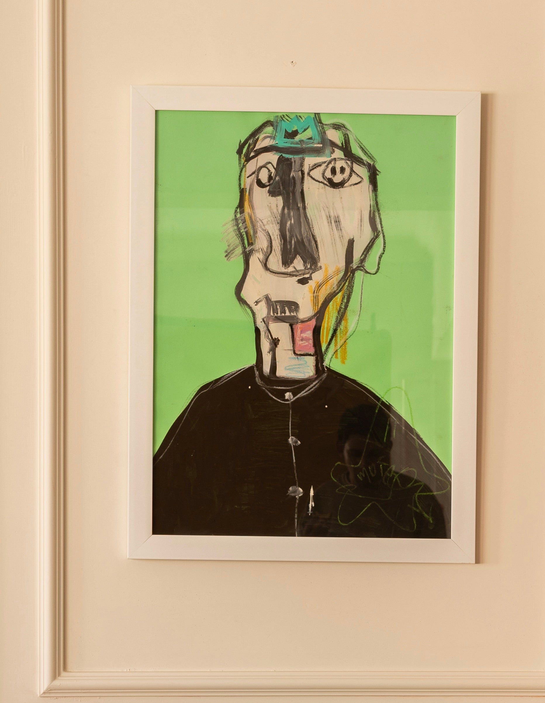 Un rostro alargado y fragmentado, delineado con trazos negros y acentos de color, se impone sobre un fondo verde intenso.