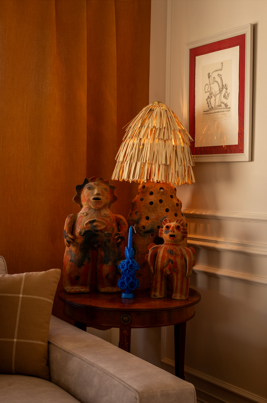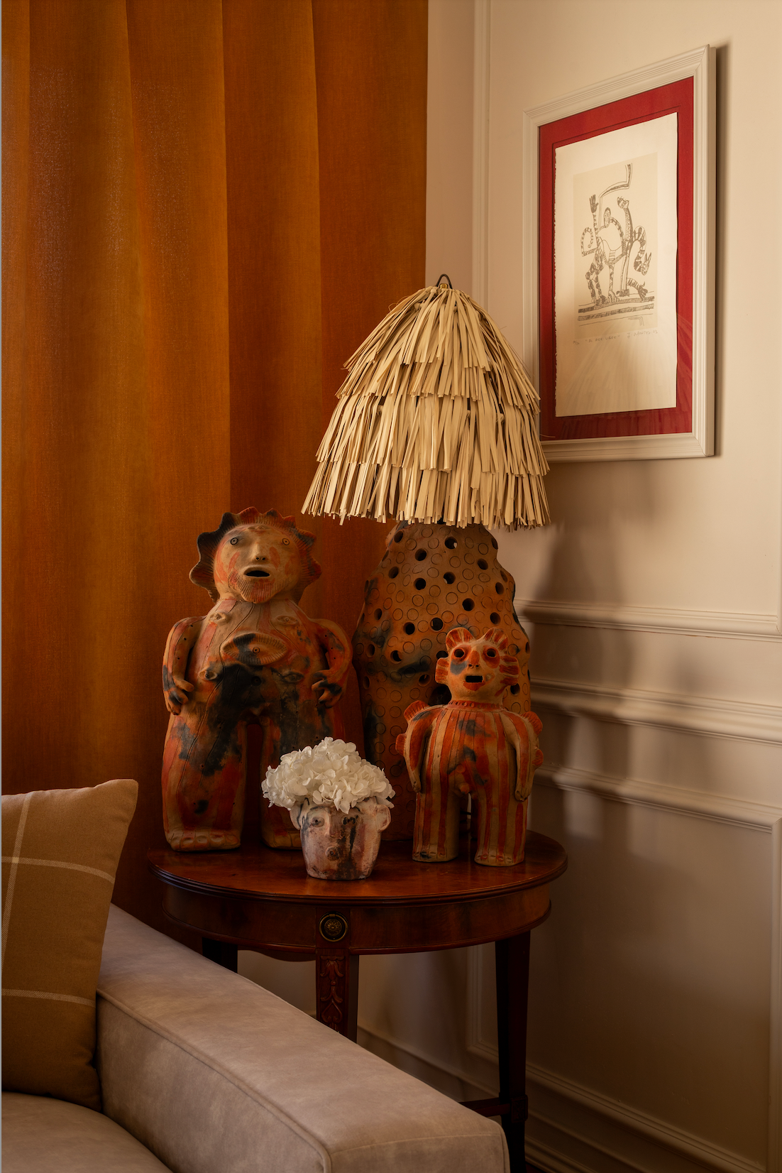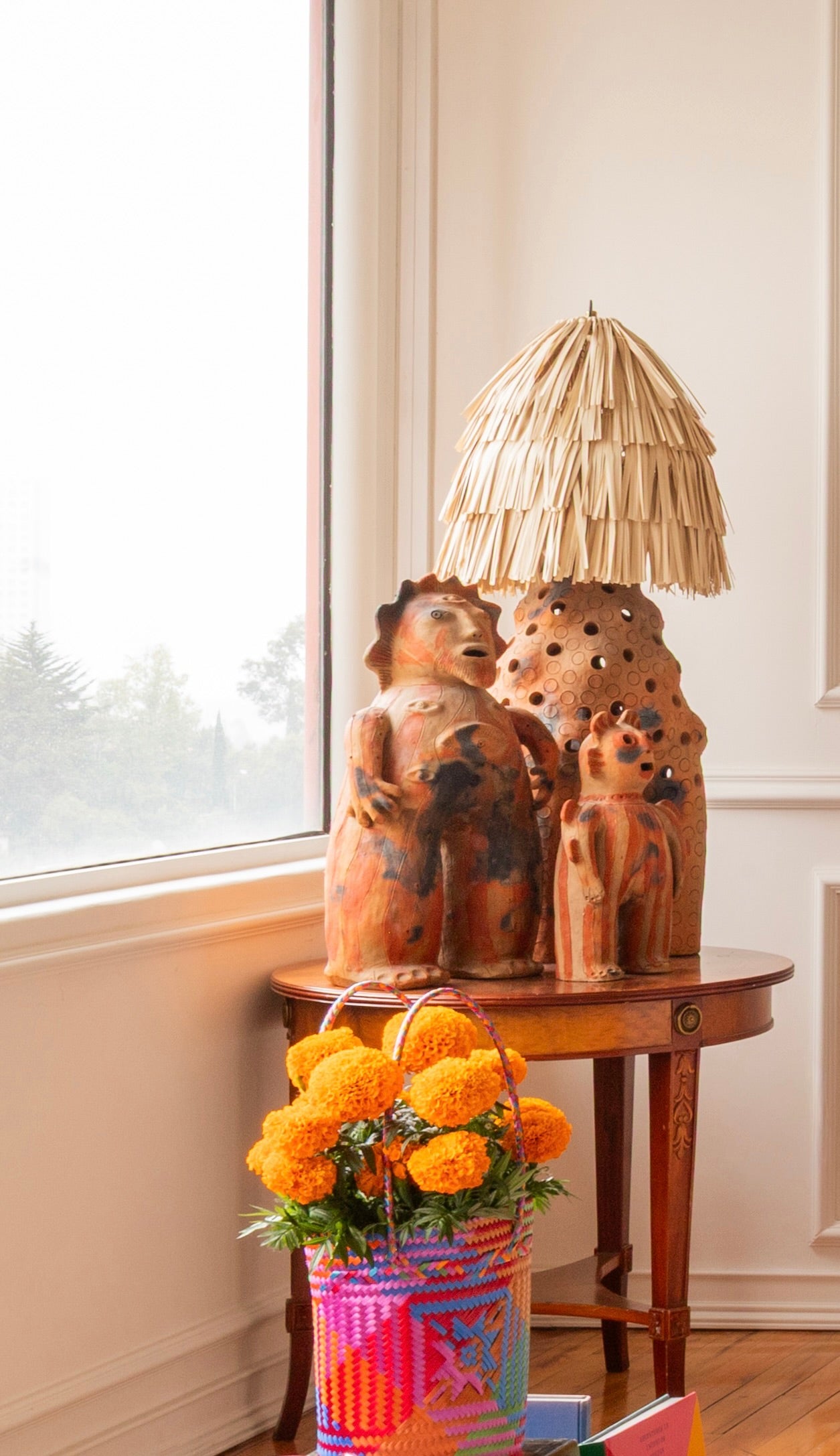 La pantalla de palma tejida a mano y las hortensias preservadas completan este altar contemporáneo, donde la tierra y la luz se unen en un gesto poético y ceremonial.