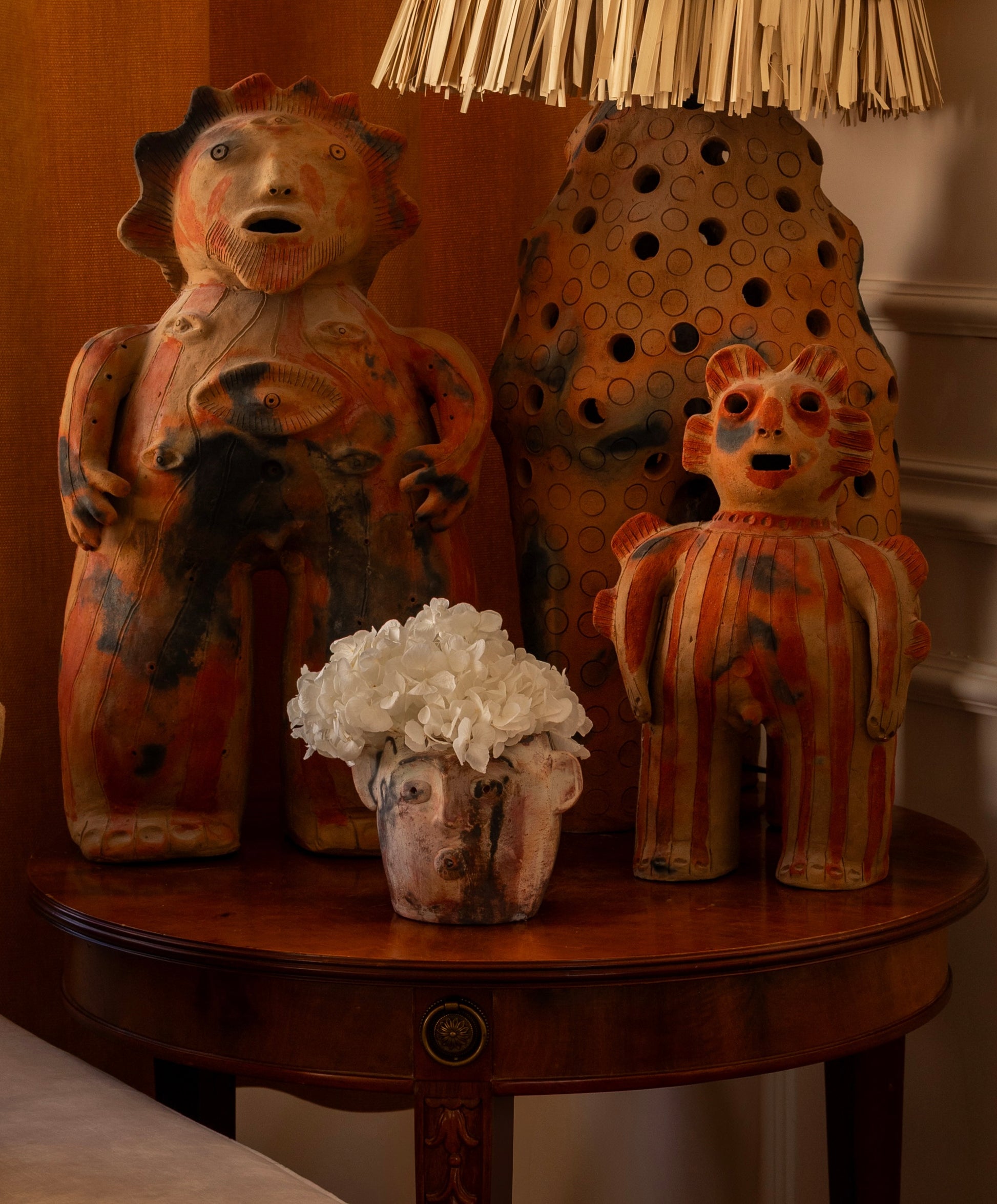 Dos figuras de barro con rasgos de ajolote evocan guardianes primordiales.