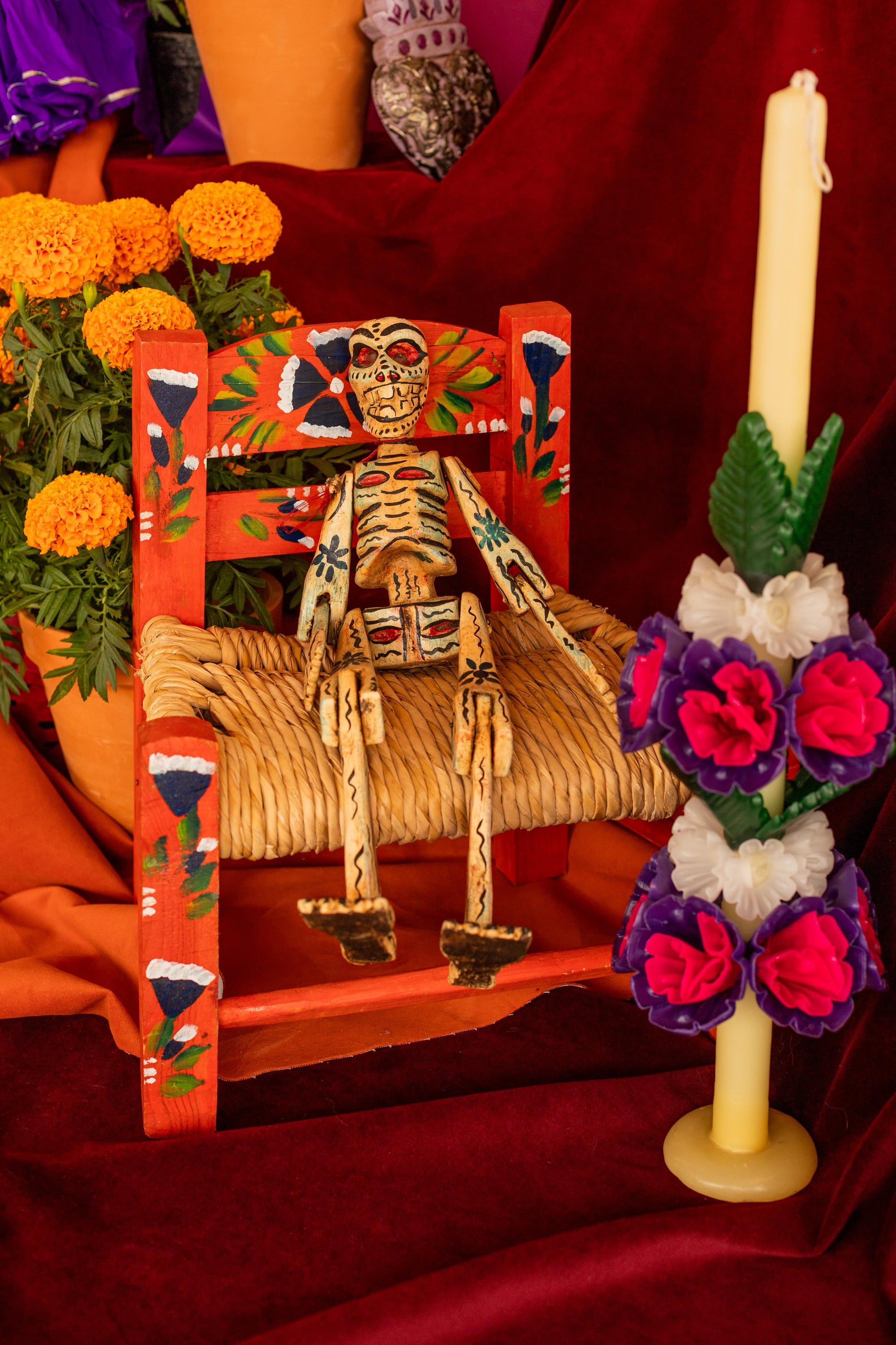 Sentada sobre una silla de madera pintada a mano y asiento de tule tejido (talpuhaja), la figura encarna la calma y la contemplación propias del Día de Muertos: la pausa entre mundos.
