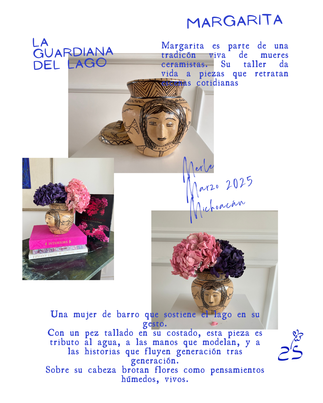 Sobre el artista o artesano: Margarita es parte de una tradición viva de mujeres ceramistas en la región lacustre de Pátzcuaro, Michoacán. Su taller da vida a piezas que retratan escenas cotidianas, rostros femeninos y elementos de la pesca tradicional, entre barcas, redes y agua. Cada obra contiene historia, arraigo y mirada.