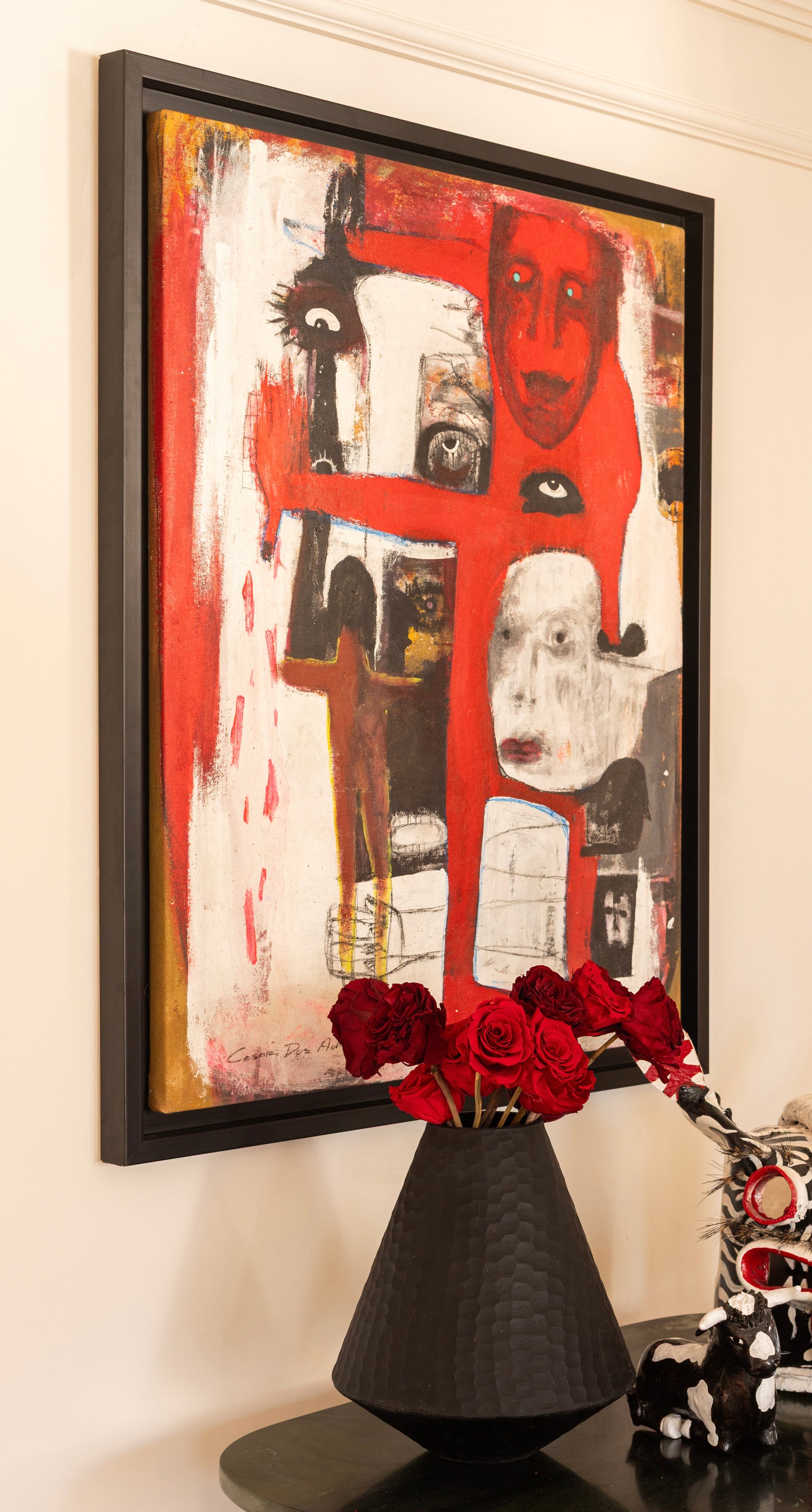 El rojo —vivo, ritual, sangrante— invade la superficie, creando un paisaje interior donde la figura humana se disuelve en emoción pura.
