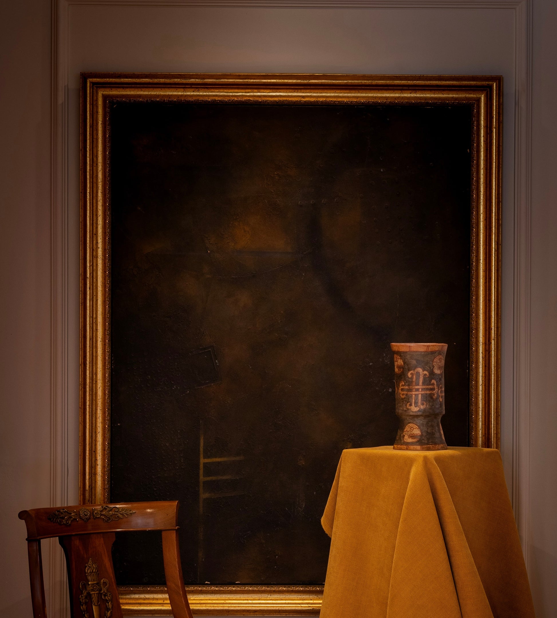 Un lienzo en tonos tierra que despliega profundas veladuras y reflejos dorados.