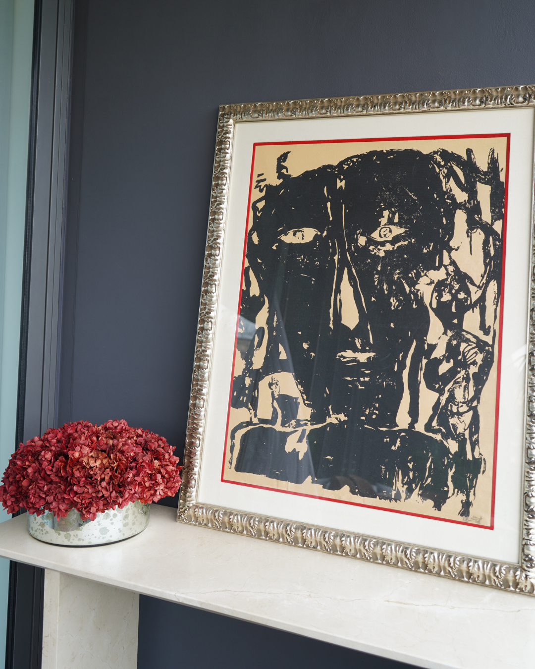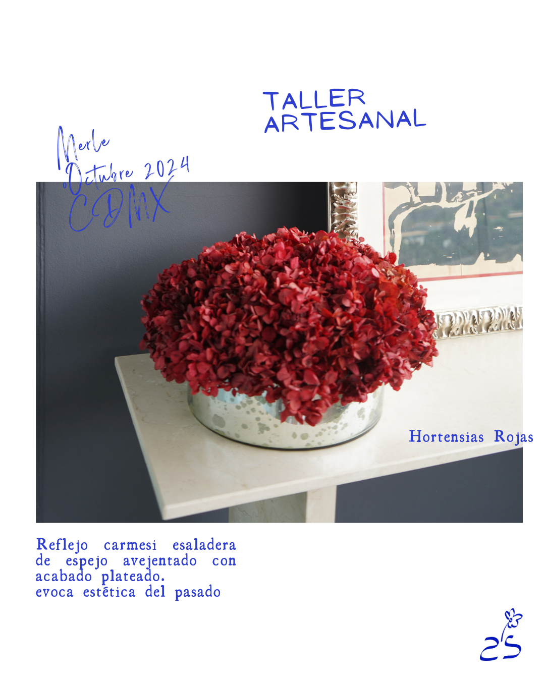 Descripción de la pieza: Una floración densa y dramática emerge de un espejo que ya no refleja: sostiene. Esta ensaladera plateada con acabado avejentado ha sido intervenida por Oud & Moss con hortensias preservadas, creando una pieza intensa y serena. Un gesto rojo sobre una superficie que susurra historia.