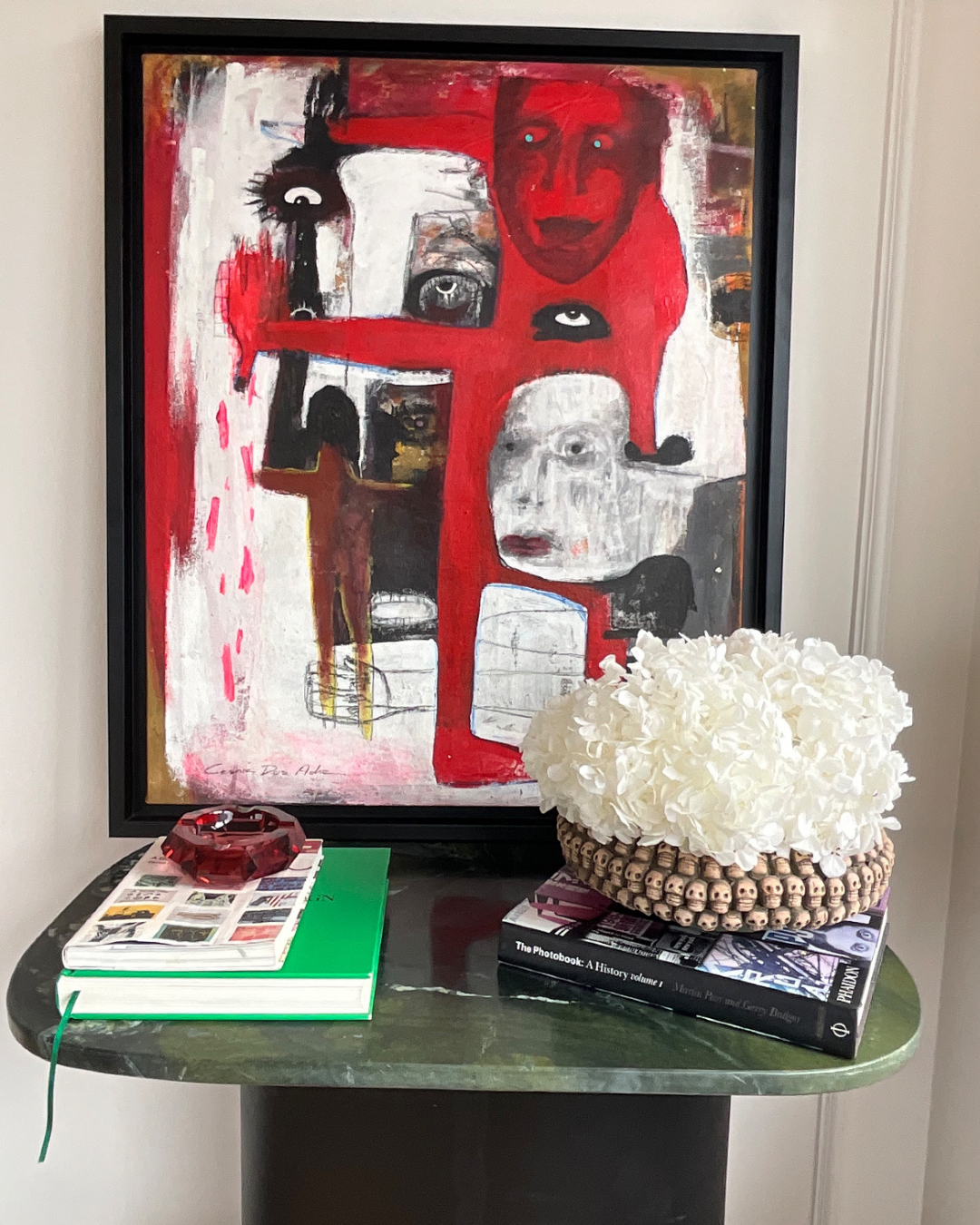 Esta vasija con cráneos en anillo, utilizada antiguamente en ceremonias estacionales y funerarias, ha sido intervenida por Oud & Moss con hortensias preservadas que transforman su sentido: del recuerdo al renacimiento.