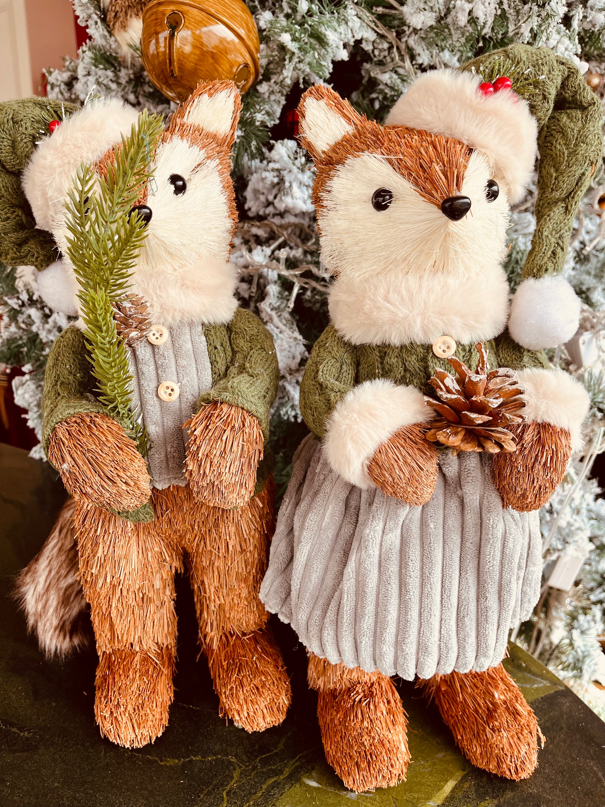 Esta encantadora pareja de zorros está elaborada a mano con varitas naturales y fibras vegetales trenzadas, vestidas con textiles invernales en tonos verdes, grises y marfil.